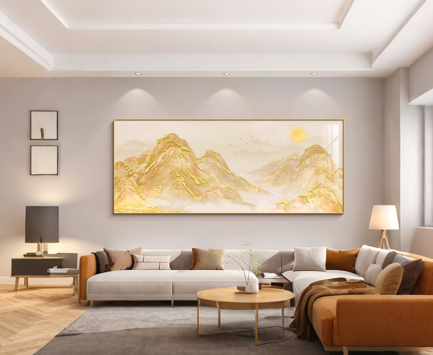 Golden Mountain Landscape Wall Art: Luxury Gilded Chinese Style Canvas Painting with Mist, Sun and Birds. Modern Decor for Living Room, Bedroom – Serene Aesthetic Wall Decor for Home Interior.